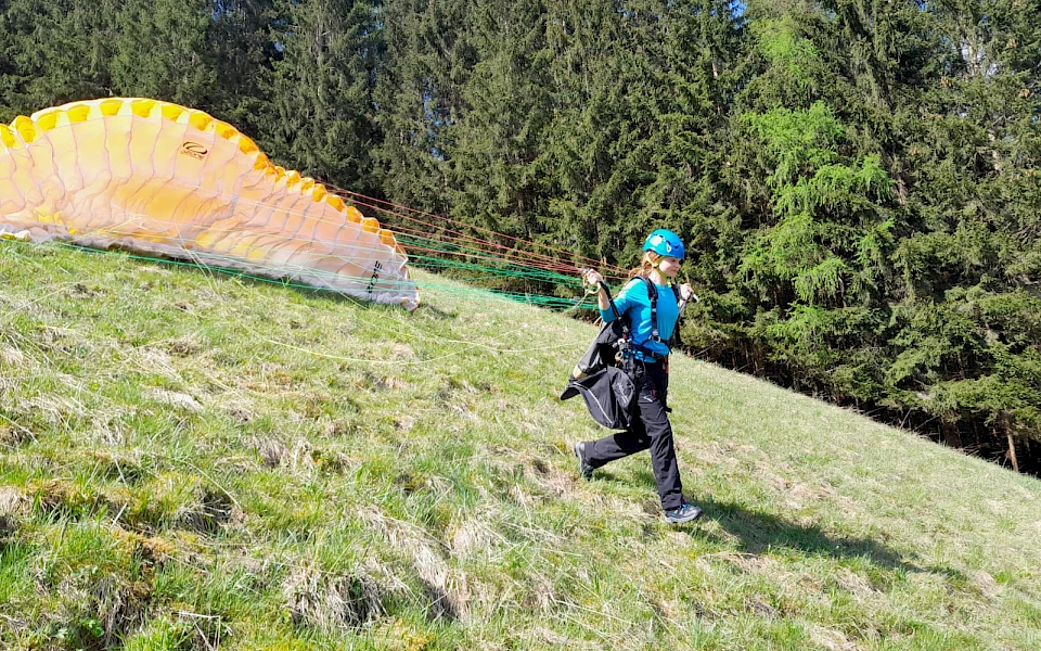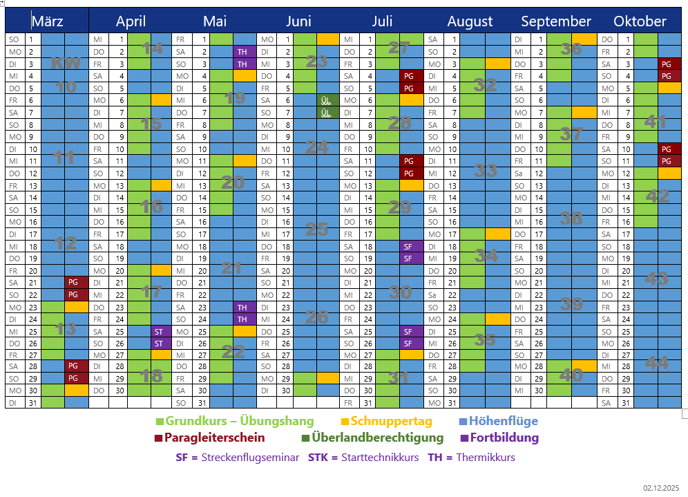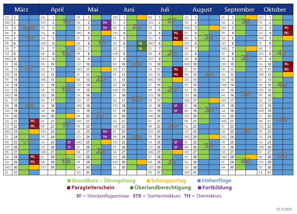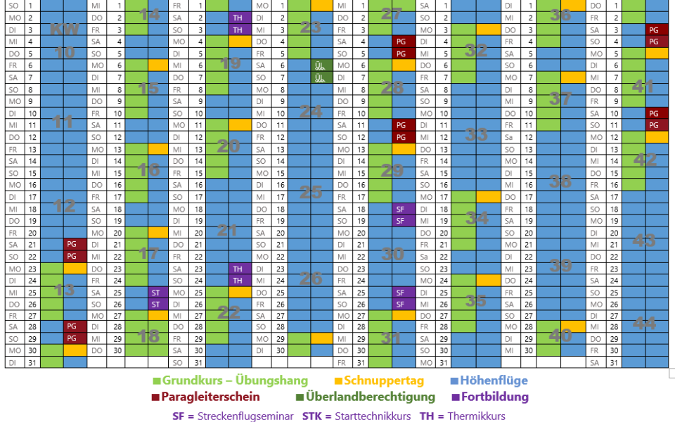 Anschließend und am darauffolgenden Wochenende machen wir die ersten Höhenflüge (Kalender Blau) von 300 bis 1200 Höhenmeter mit Funk. Nach mindestens 5 Flügen kannst du mit der Schulungsbestätigung abschließen. Deine fehlenden Höhenflüge können auch tageweise und an anderen Wochenenden bei Flugwetter gesammelt werden.